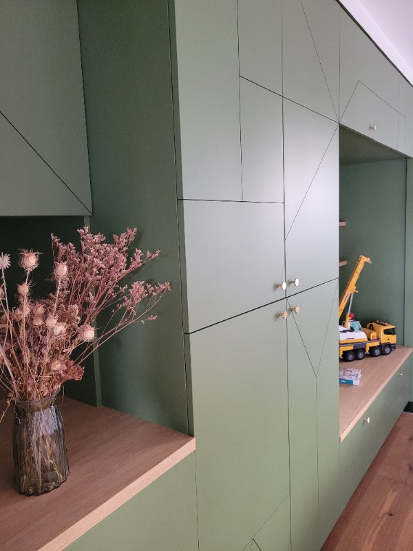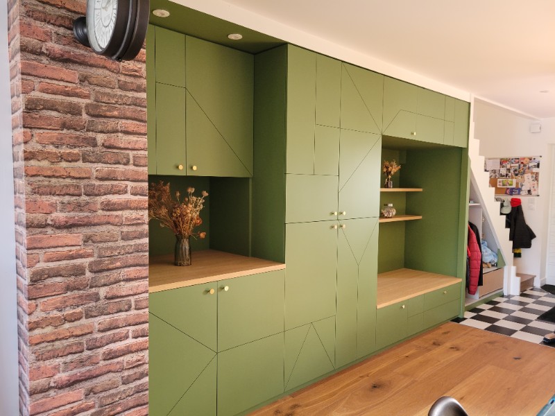 Nous avons choisi une peinture verte intense, entre sapin et eucalyptus, pour lui offrir une identité forte et naturelle. Ce vert foncé souligne la longueur du meuble et met en valeur sa ligne sobre, tout en créant une continuité élégante entre l’entrée et la pièce de vie. Associé aux murs blanc, il équilibre la luminosité et ancre visuellement les volumes.