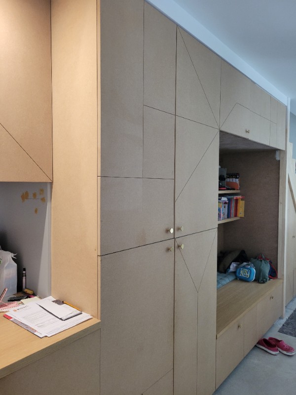 Ce placard d’entrée, réalisé sous l'escalier et sur toute la longueur du mur entre l’entrée et la salle à manger, avait été conçu pour être peint dès la construction de la maison. Mais deux ans après l’emménagement, il était toujours resté brut, discret, presque oublié. Mes clients avaient envie qu’il retrouve enfin la place qu’il mérite.