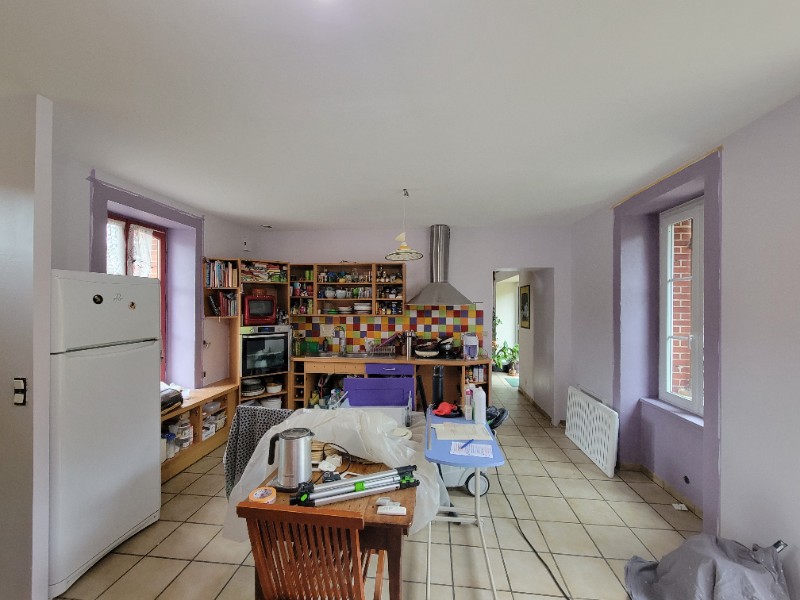 Je me suis inspirée des portes du grand placard situé dans la pièce pour définir la nouvelle palette. Le plafond a été repeint en blanc pour apporter de la lumière, puis les murs ont été peints dans un mauve clair apaisant. Pour souligner les volumes et les ouvertures, j’ai choisi un mauve plus soutenu sur les embrasures de fenêtres. Enfin, les portes de la cuisine ont été repeintes dans un violet profond, proche de celui des carreaux de la crédence, pour créer un lien visuel fort et élégant.
