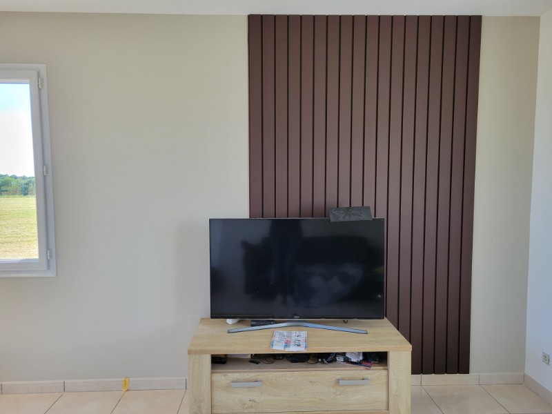 J’ai posé un revêtement mural 3D Orac Decor (modèle W111), peint ensuite dans un brun profond. Pour accentuer l’effet graphique et chaleureux, j’ai ajouté des tasseaux de bois brut à côté du panneau décoratif.